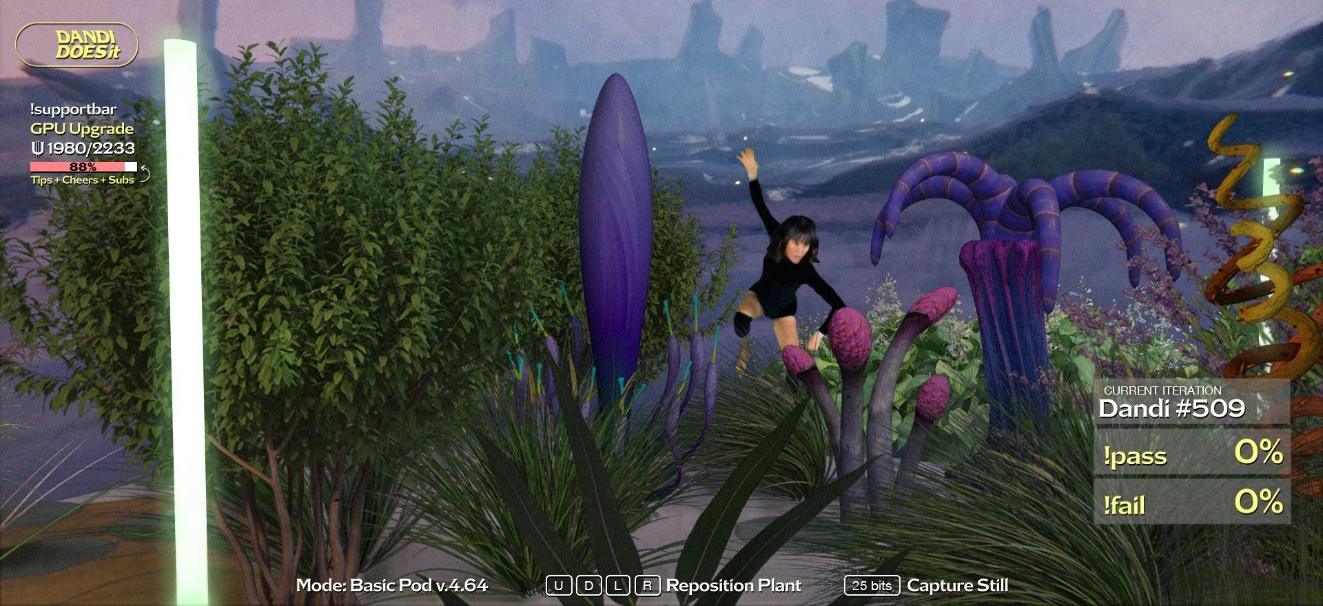 The year is 3021, faster than light travel is possible, and other species in the local cluster of galaxies now mingle. Capitalism is alive and well, and The Company has basically acquired all other companies. One of The Company's branches deals with the production of clones, called 'Offsets', and The Dandi Line of Offsets is one such project. The Twitch users roleplay a sometimes-ambiguous role in the fiction, but most of the time they are Quality Assurance testers for the Dandi Line, and they observe each iteration of Dandi, and pass or fail it based on their performance. Passed Dandis go off-world to their destiny. Failed Dandis are decommissioned. A future where People are products. Company employees having control over Dandi's fate and body.(4) This mixture of Dandi’s purity and likeability and the possibility that the audience can destroy her—and do, makes a complexity to Dandi Does It that keeps me coming back to her streams for new episodes, not just the new 3D environments and new Company storylines.