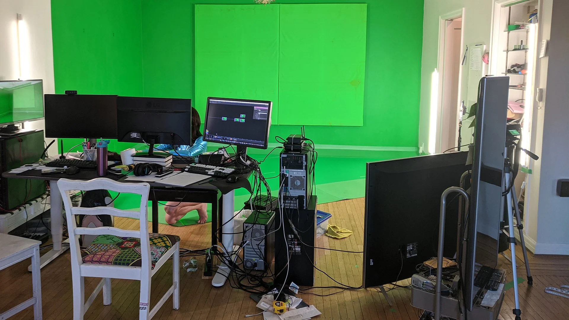 Dandi Does It, Media Meltdown and The Sushi Dragon all use their chat and subs in inventive ways outside of commentary and bater. Subbing gets the viewer special access to emojis and other perks; On Dandi Does Its workout-wellness show subbing means you can work out as a blob with a top hat or have penguins to wander into the fray. Media Meltdown plays games like bingo and takes polls with the chat. In an interview, The Sushi Dragon described his chat audience as a collective consciousness. A very interesting observation from the performer who literally wears a screen with the chat on his chest. What his comment struck me as, was someone who viewed all the voices as a single entity with many arms, moving together but acting independently. The Sushi Dragon credits his chat with helping him to program his stream, as collaborators not simply viewers. In fact, he said he didn’t know anything about programming and his chat members were instrumental in his developing his extensive technical set up. A The Sushi Dragon broadcast uses several camera angles to create the illusion of more than a one-person crew at work; all made by hacking into other motorized vehicles, several servers, and an ever-increasing list of software, Voicemeeter, Voiceattack, OSCPilot, Chataigne, (which is the newest software that organizes all his computers—the only program that can withstand his performances without crashing) and of course OBS and TouchDesigner.